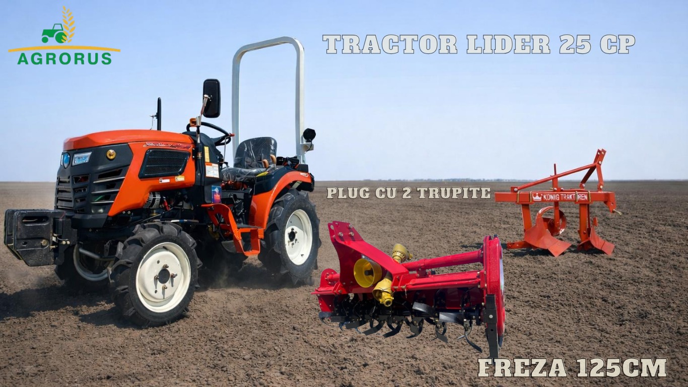 Tractor 25 CAI LIDER 4×4 + Freza agricola 125 cm + Plug agricol cu 2 trupite + Carte RAR